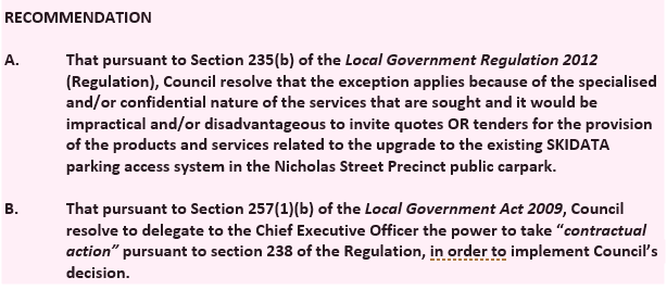 Recent internal advice notes that application of Section 235 (b) is not appropriate on this occasion and additionally that Section 235 (a) of the Local Government Regulation 2012 is now to be applied. This report has been resubmitted to account for this change and to update the recommendations for resolution by Council.