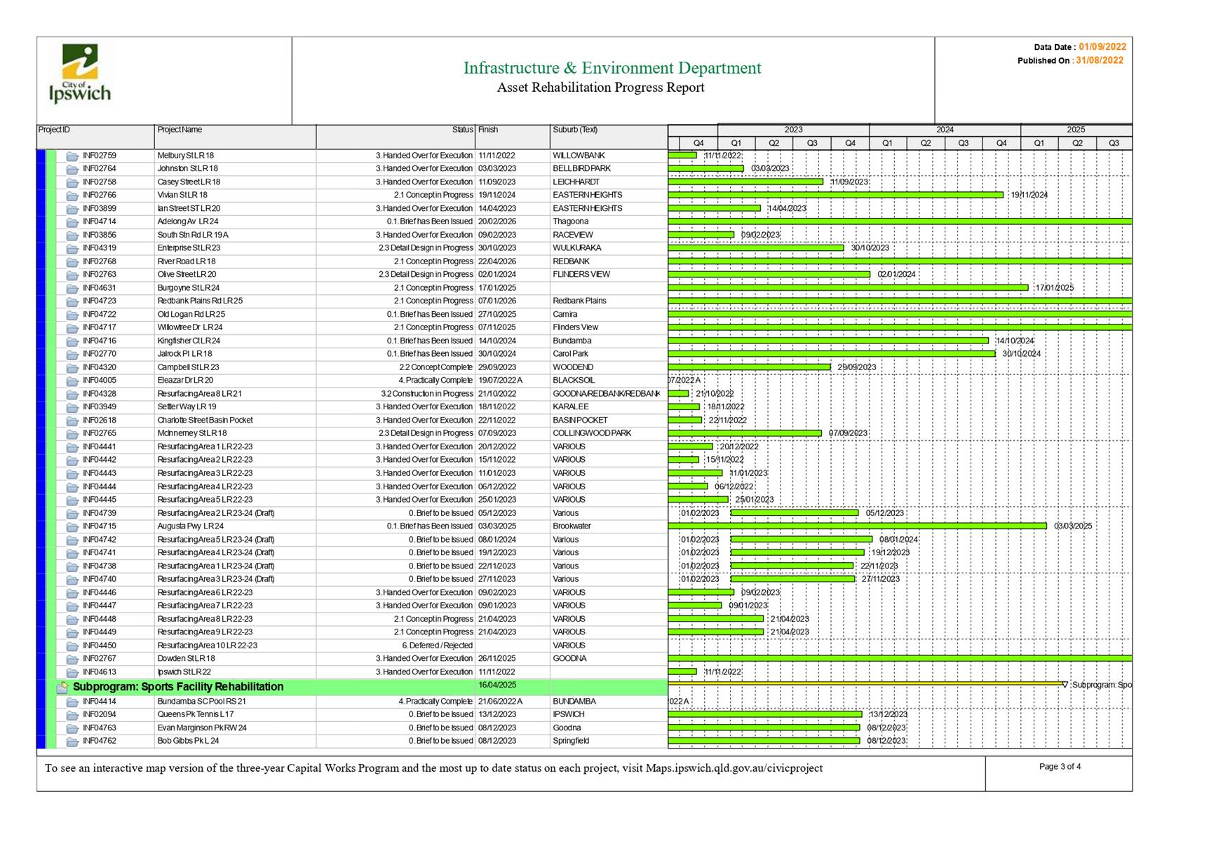 The Springfield Greenbank Arterial Rd Upgrade was $534k under budget due to the above accrual against Stage 1 and will be corrected in September reporting. The Springfield Parkway Stage 3 design IFC drawings are still being reviewed by TMR and service relocation designs are almost complete.