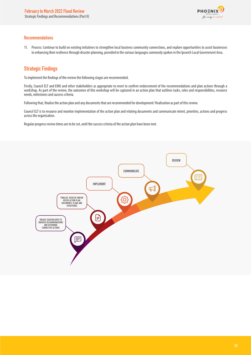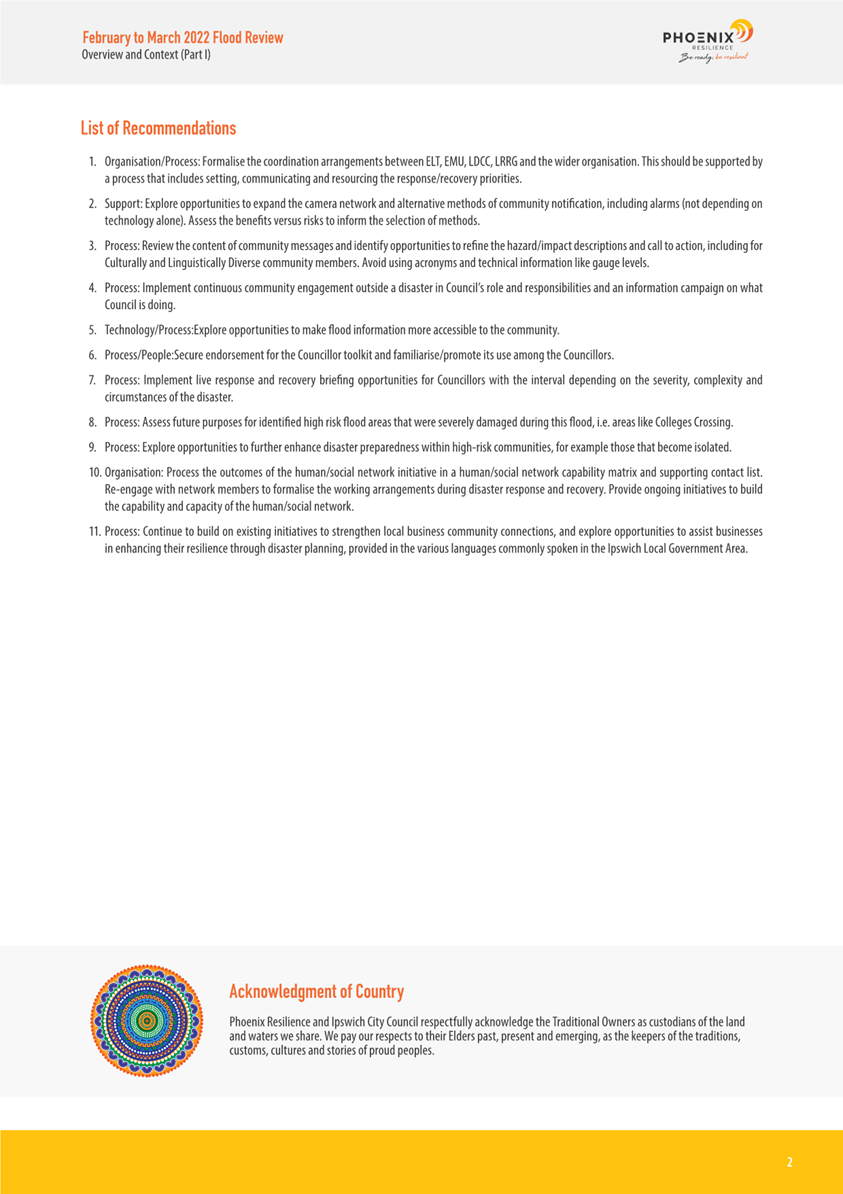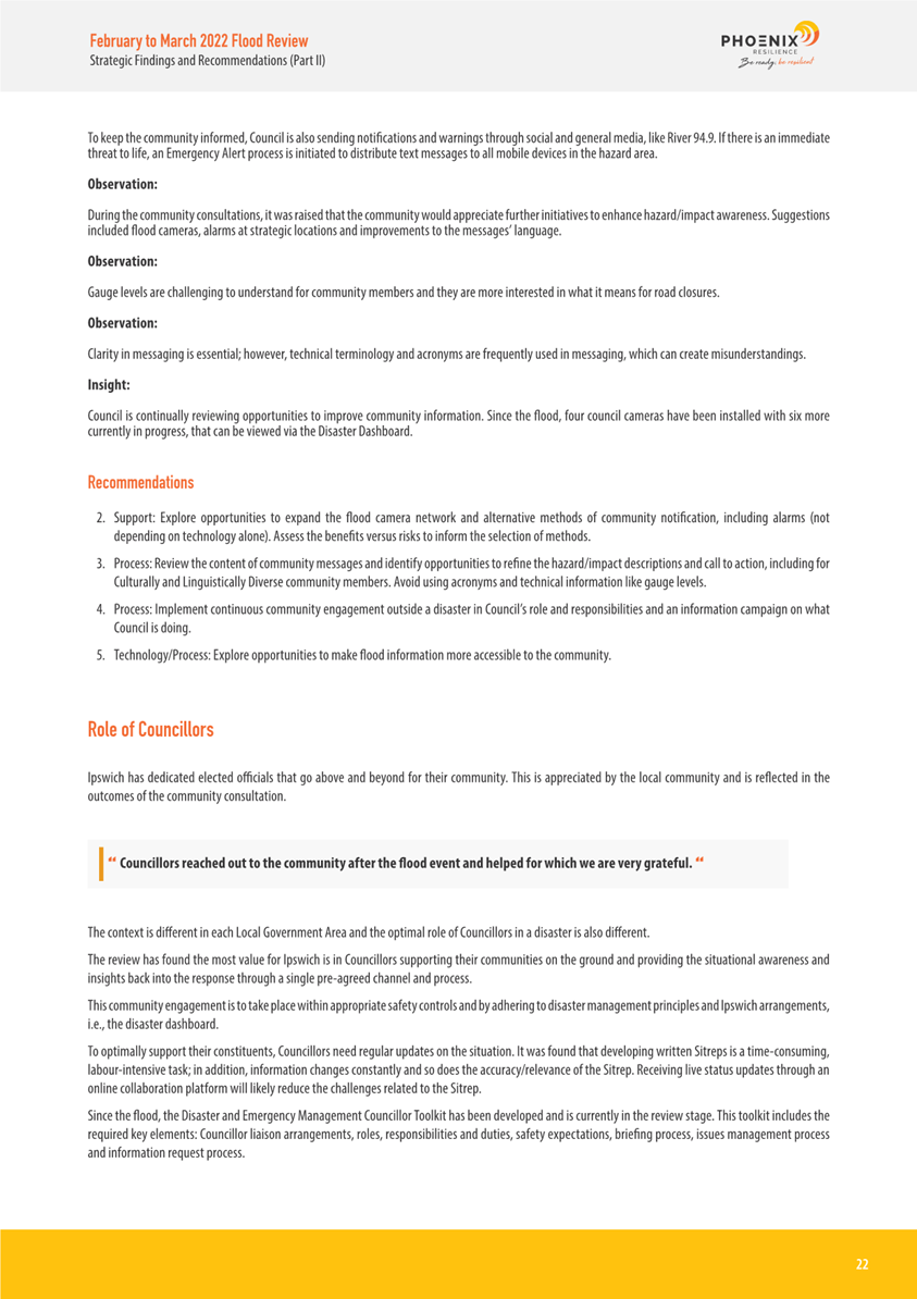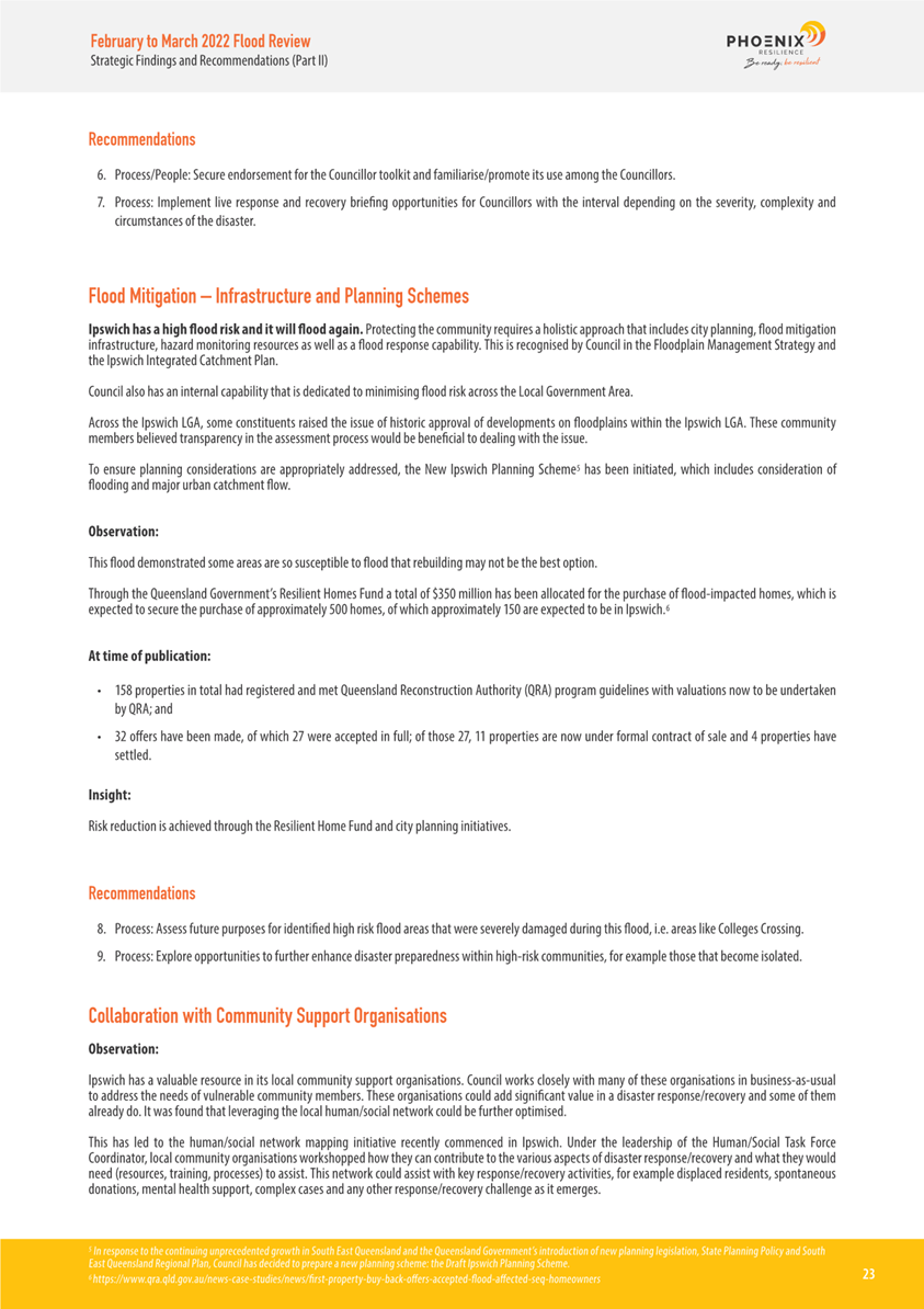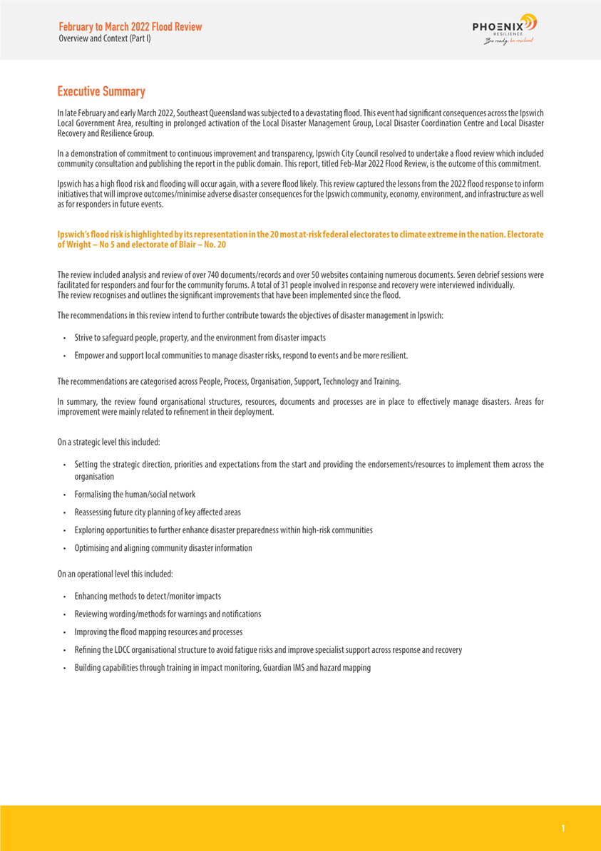 Though much work has already been undertaken to improve the Ipswich disaster management arrangements since the February Flood of 2022, the Flood Review 2022 outlines further opportunities for improvement. Progressing through the recommendations of the Flood Review 2022, in alignment with the recommendations identified in the IICP Actions List/Investment Strategy, will ensure technical and community consultation is acknowledged and acted upon, and position both Council and the community well for future flood events.