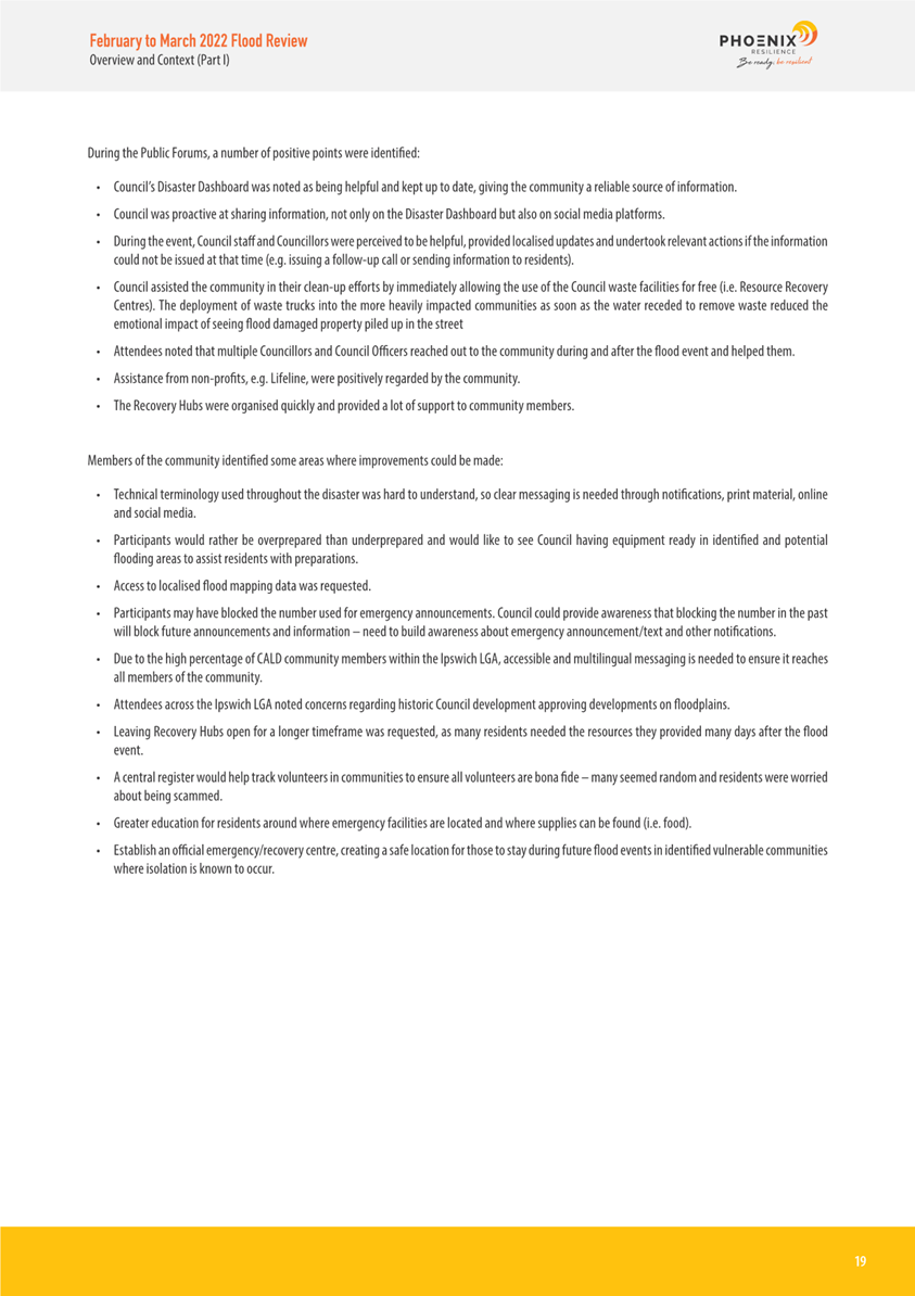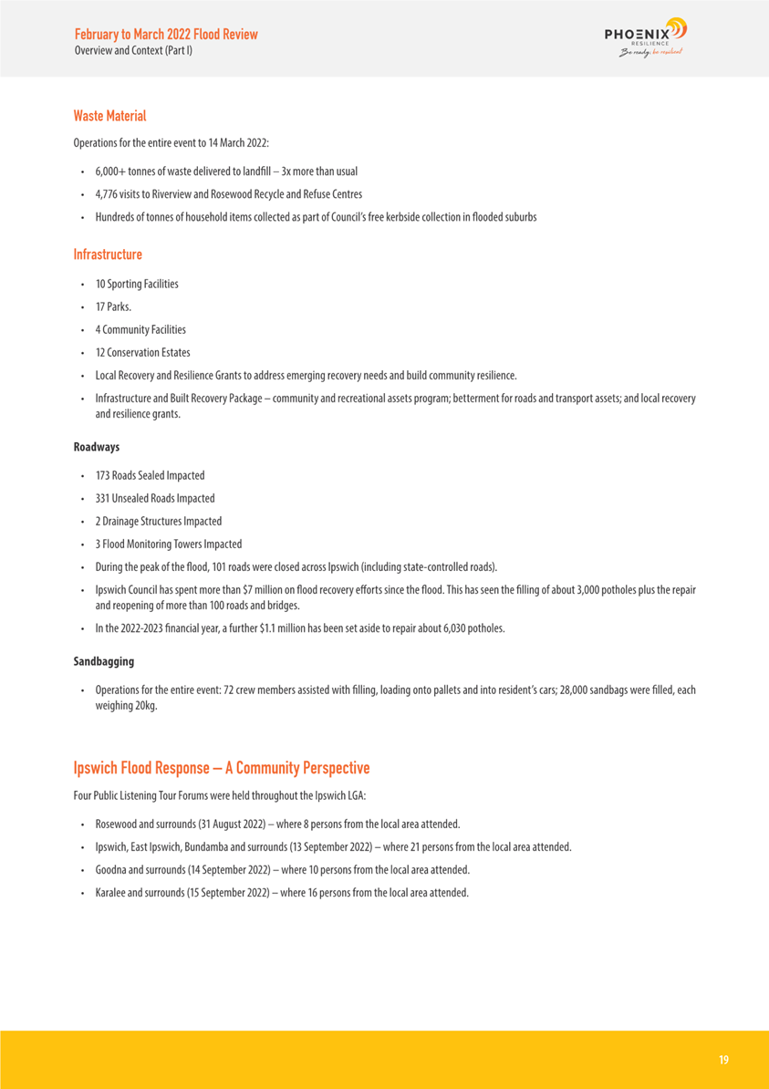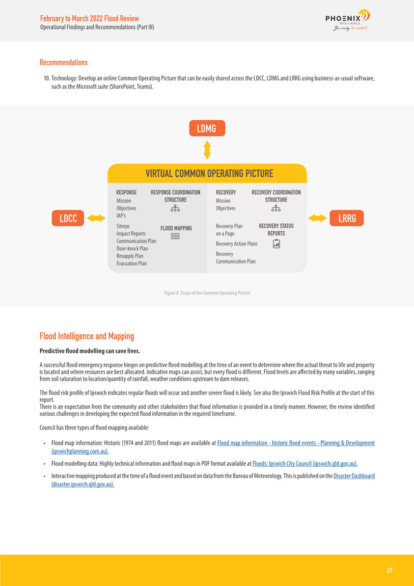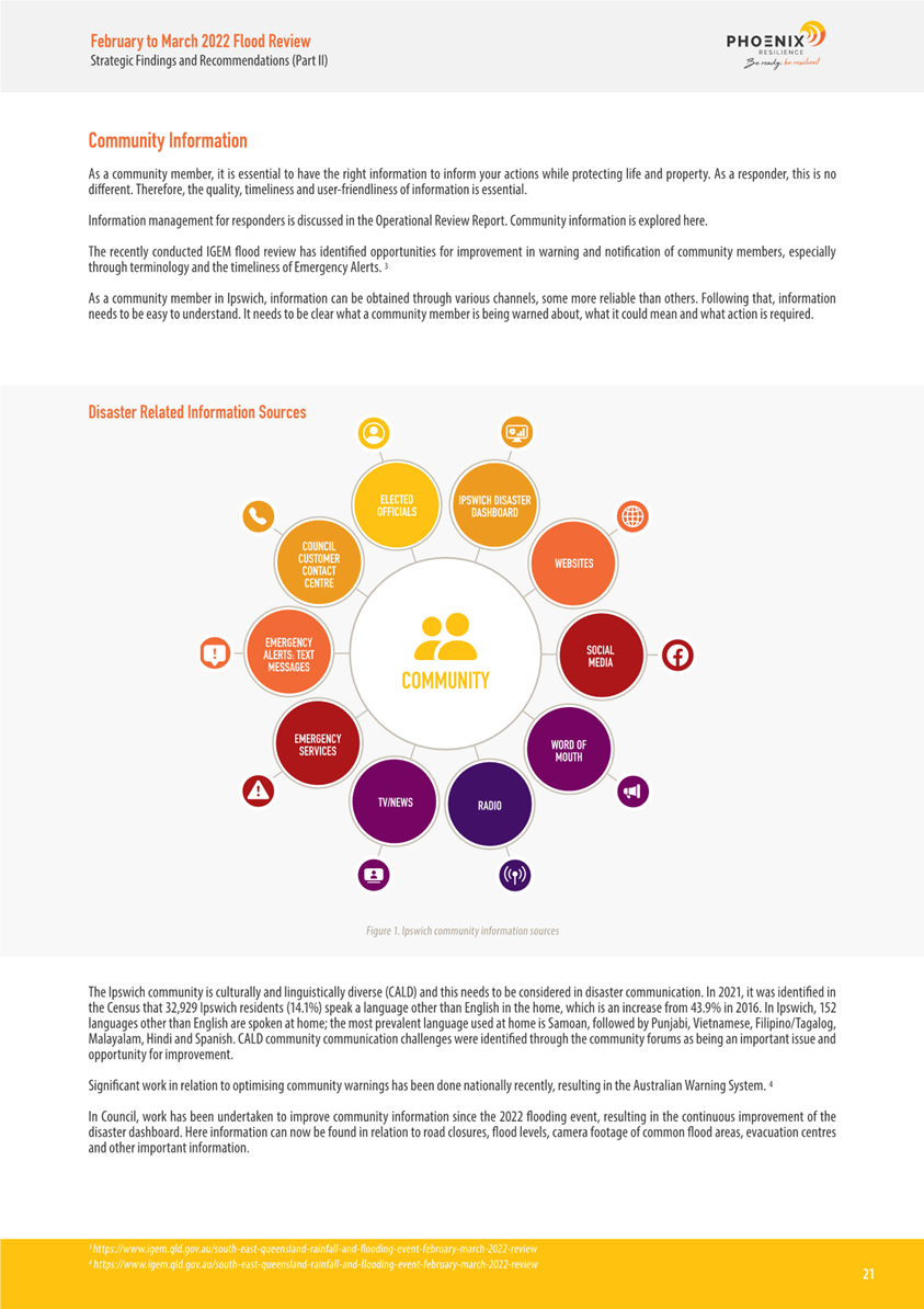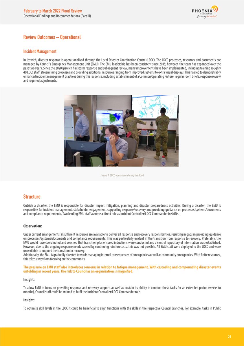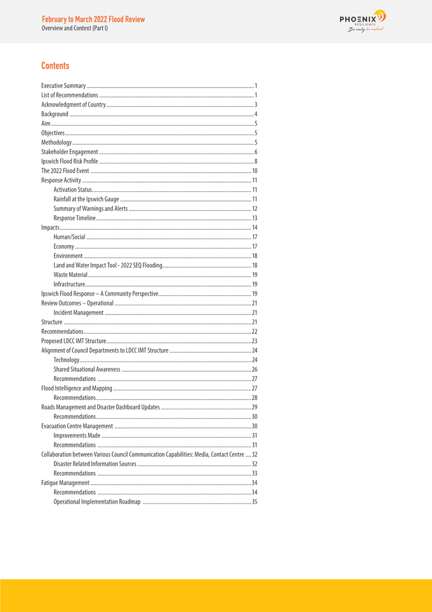 Though much work has already been undertaken to improve the Ipswich disaster management arrangements since the February Flood of 2022, the Flood Review 2022 outlines further opportunities for improvement. Progressing through the recommendations of the Flood Review 2022, in alignment with the recommendations identified in the IICP Actions List/Investment Strategy, will ensure technical and community consultation is acknowledged and acted upon, and position both Council and the community well for future flood events.