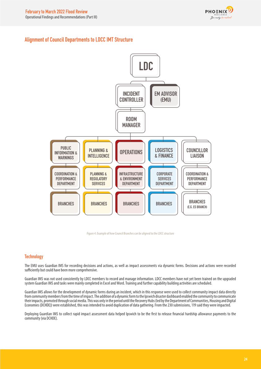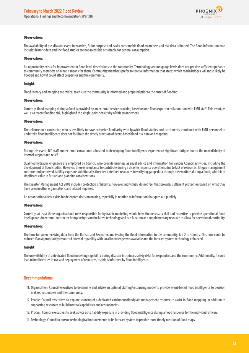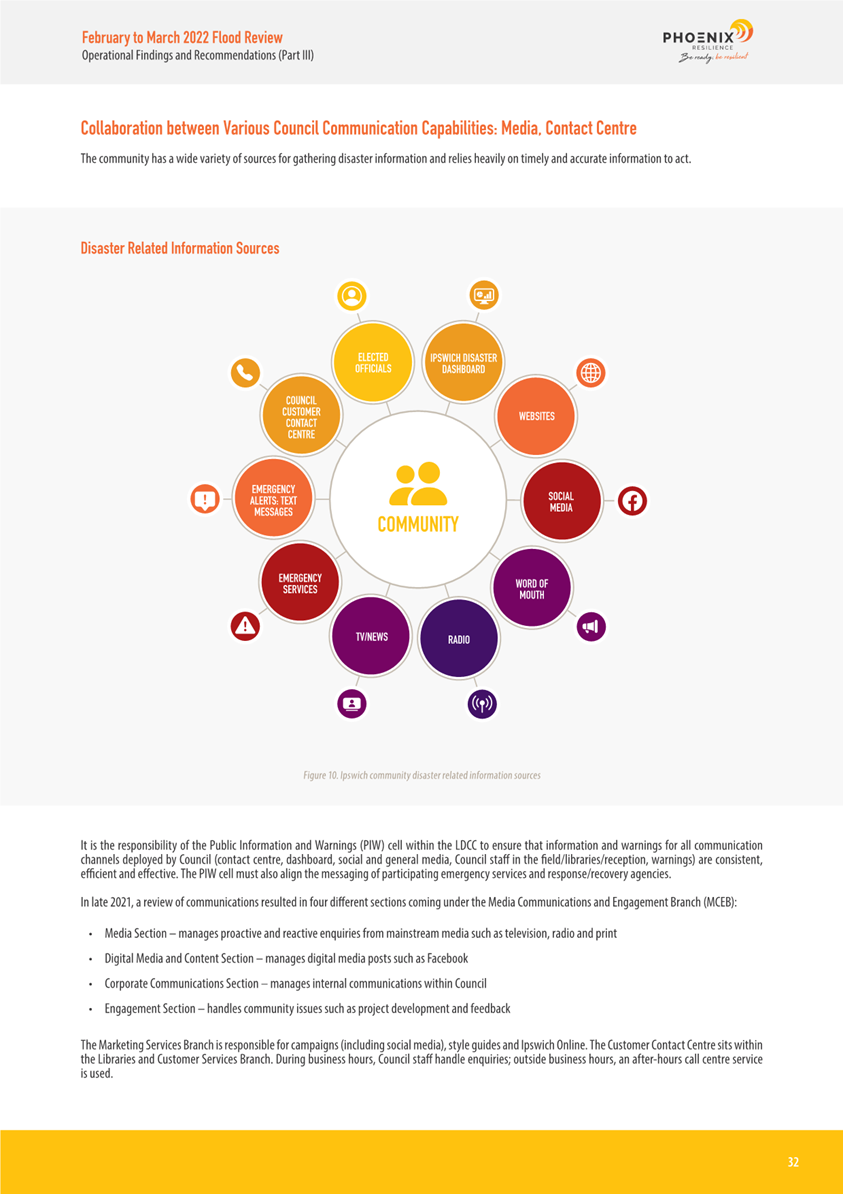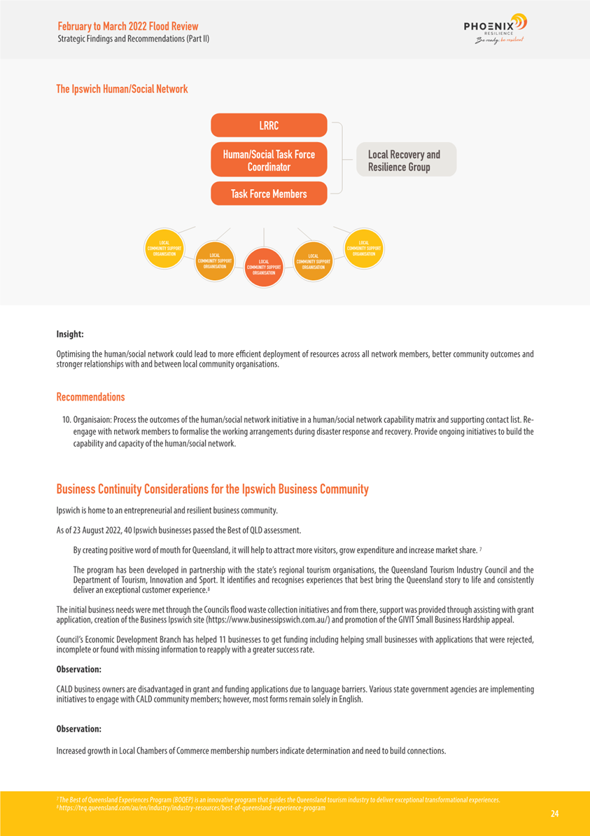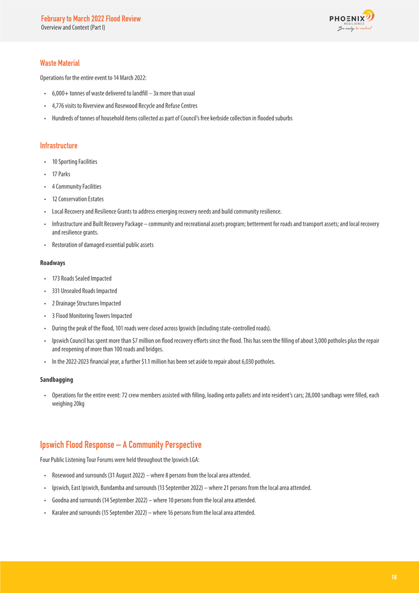 Though much work has already been undertaken to improve the Ipswich disaster management arrangements since the February Flood of 2022, the Flood Review 2022 outlines further opportunities for improvement. Progressing through the recommendations of the Flood Review 2022, in alignment with the recommendations identified in the IICP Actions List/Investment Strategy, will ensure technical and community consultation is acknowledged and acted upon, and position both Council and the community well for future flood events.
