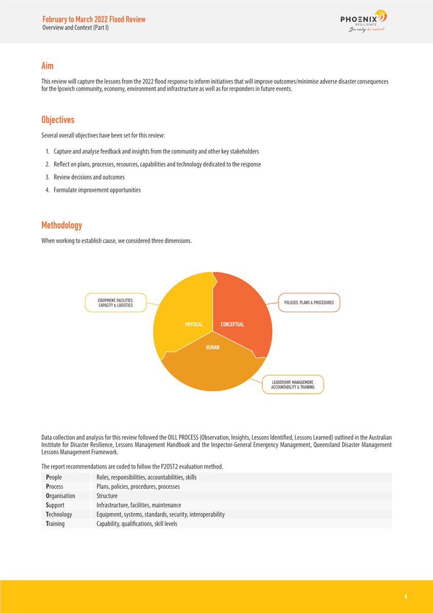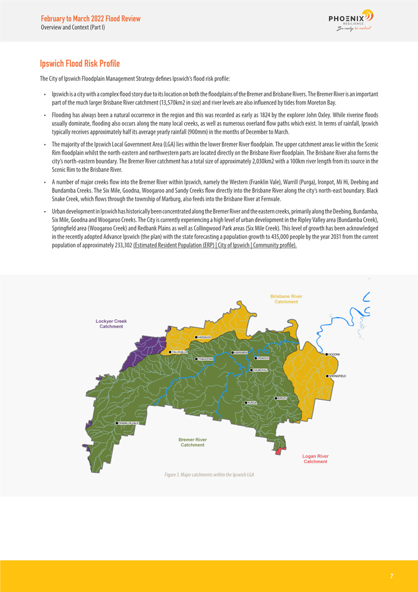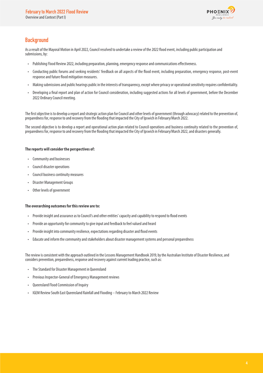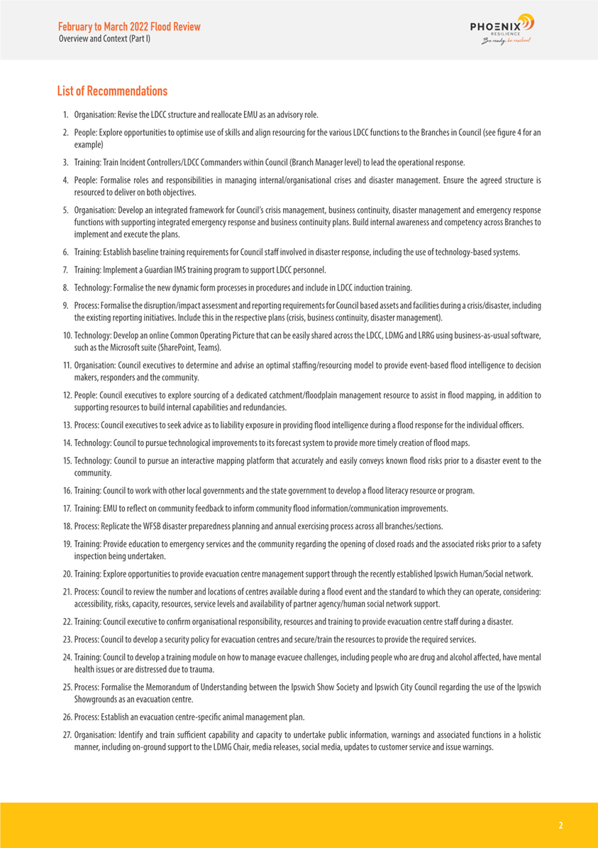 A. That the report be approved and adopted as Council ‘February 2022 Flood Review.’ B. That the report be presented to the City of Ipswich of Ipswich Local Disaster Management Group and the City of Ipswich Local Recovery and Resilience Group C. That the Chief Executive Officer be authorised to develop resourcing, implementation, and monitoring arrangements in relation to Recommendation A |