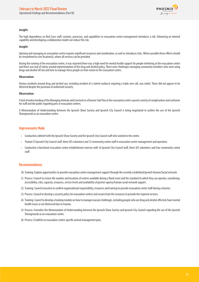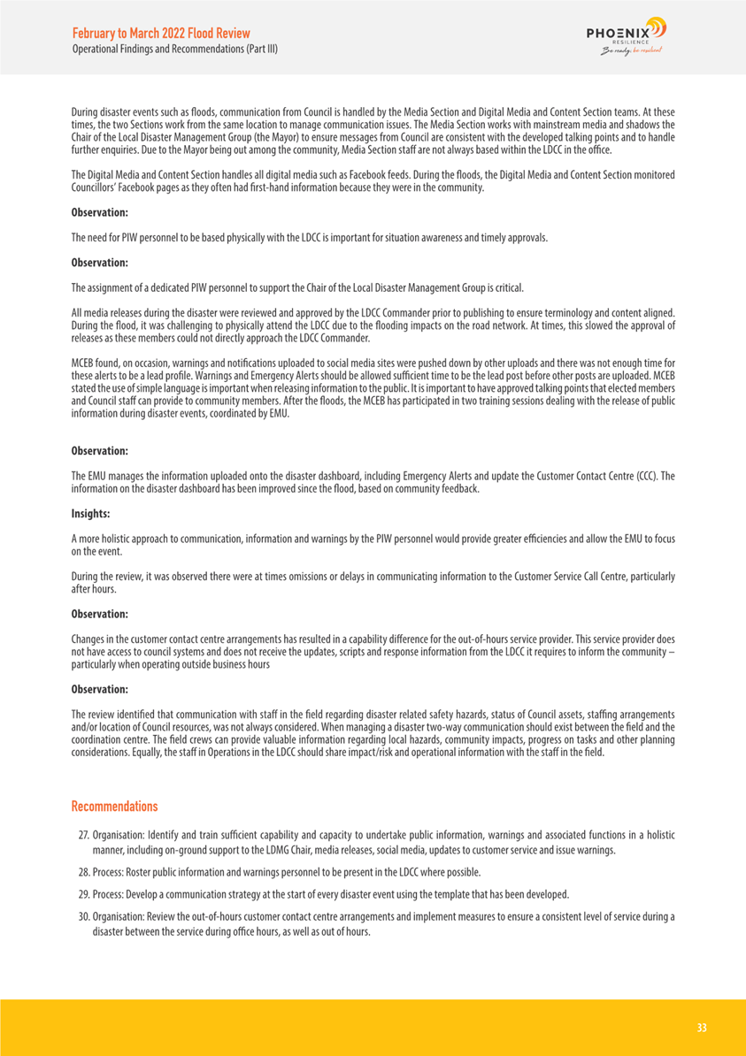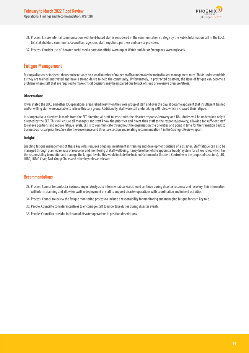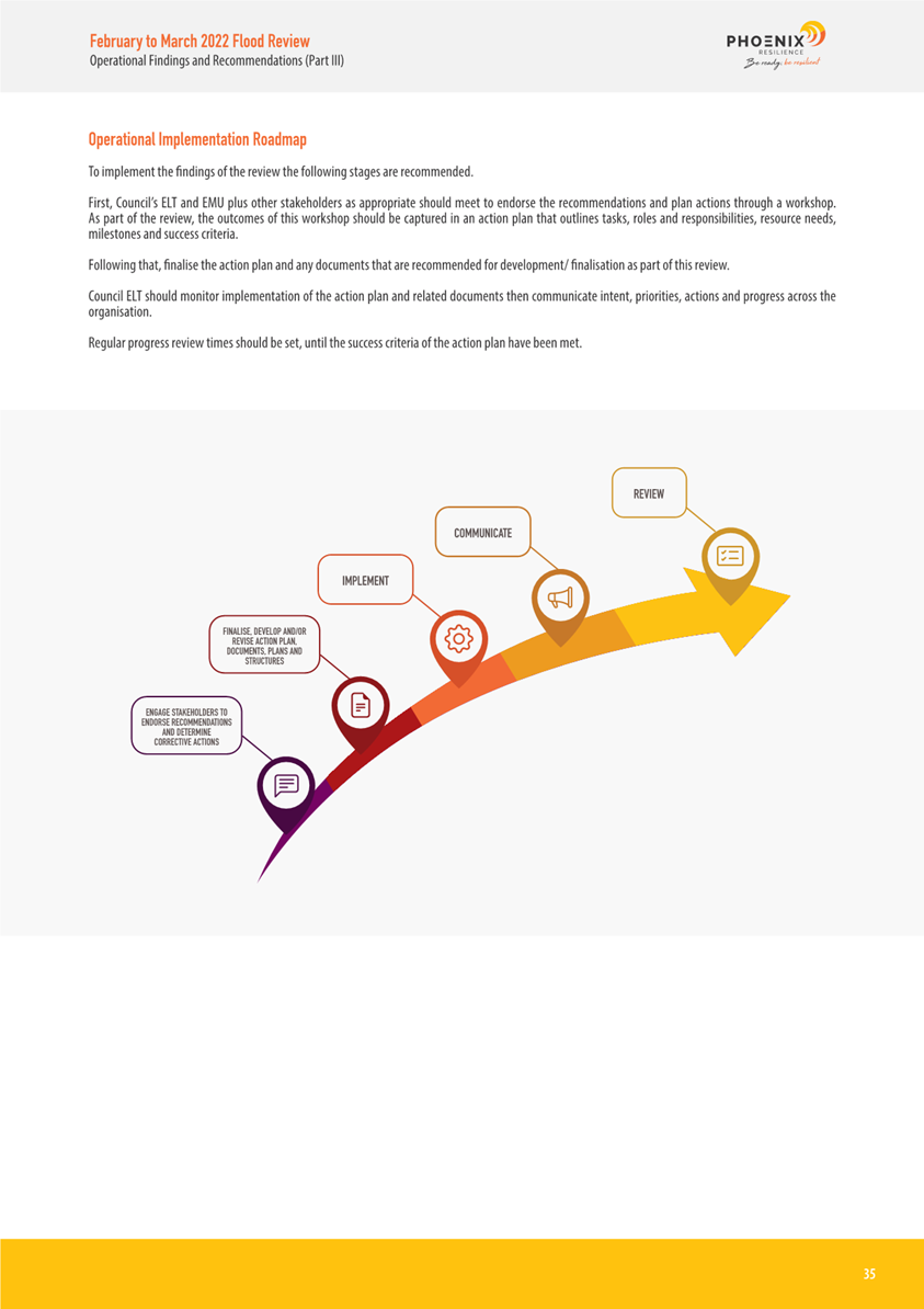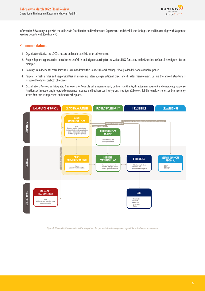 Progress against recommendations in the short term is also slowed by the necessary focus of efforts on the operational demands of the current disaster season which is expected to continue through March/April 2023. The resourcing, implementation plan and monitoring arrangements referenced at Recommendation C of this report, which will be mapped and negotiated in the near future, goes some way to mitigating this risk.