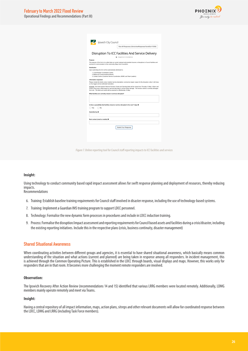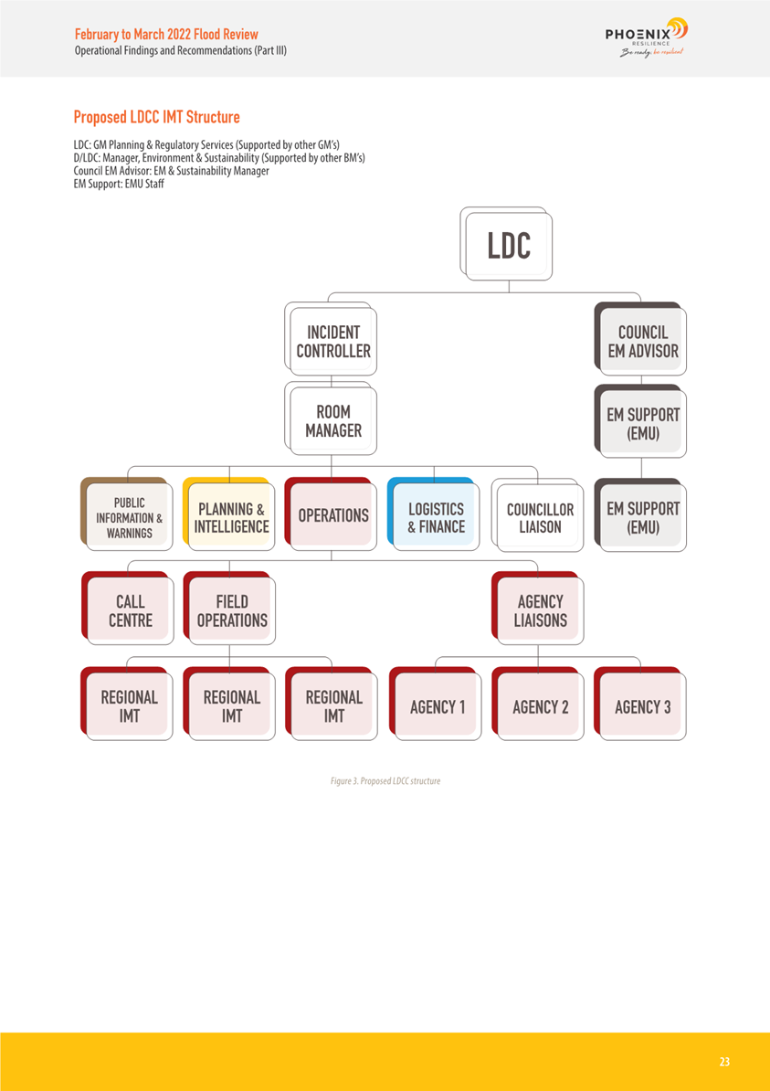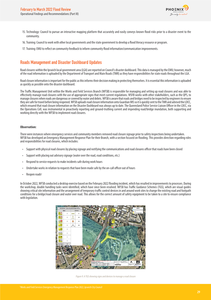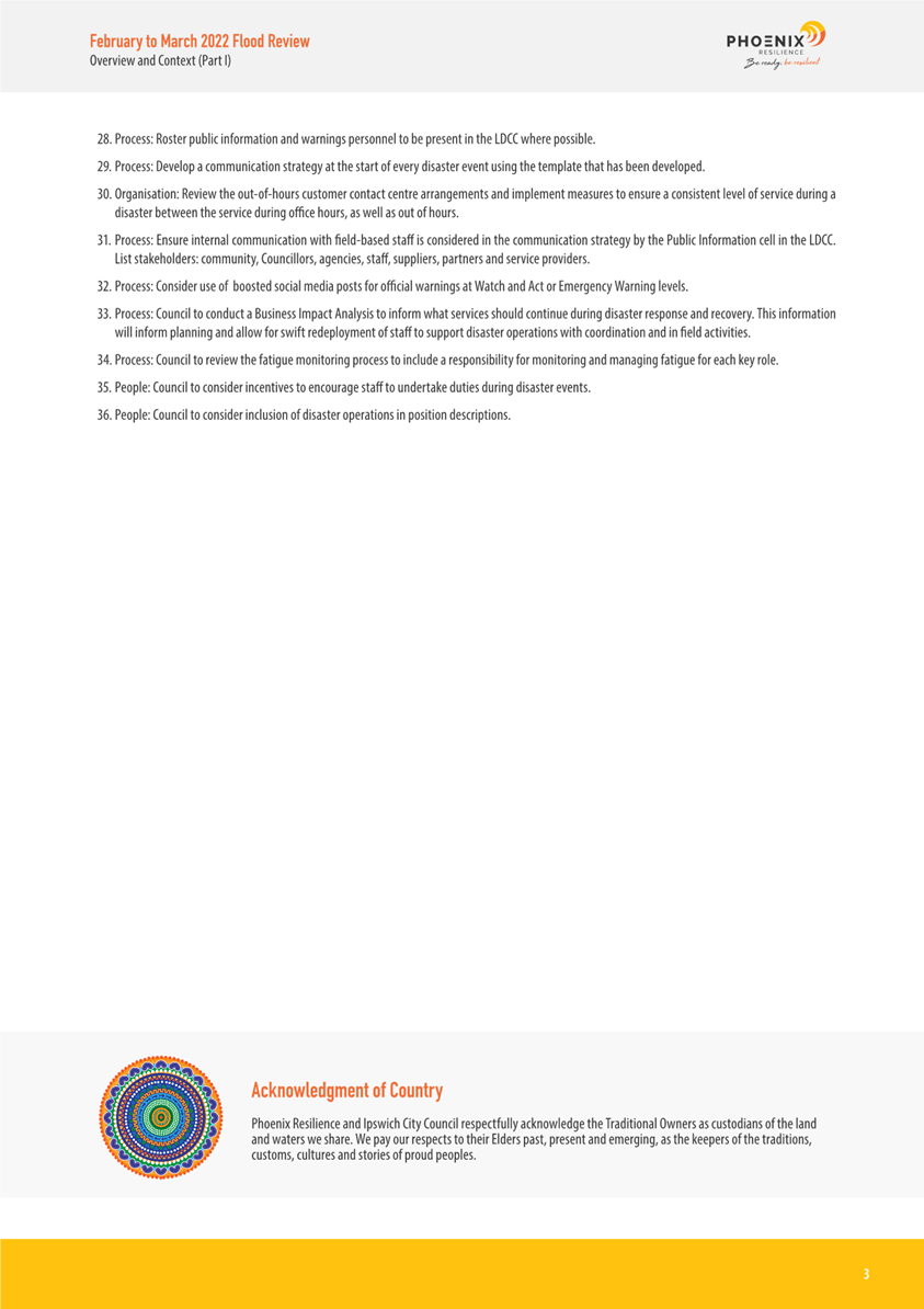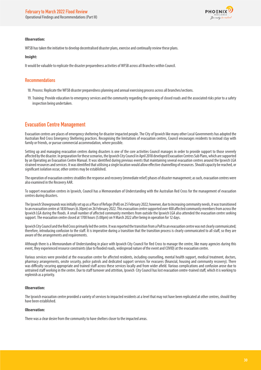 Progress against recommendations in the short term is also slowed by the necessary focus of efforts on the operational demands of the current disaster season which is expected to continue through March/April 2023. The resourcing, implementation plan and monitoring arrangements referenced at Recommendation C of this report, which will be mapped and negotiated in the near future, goes some way to mitigating this risk.