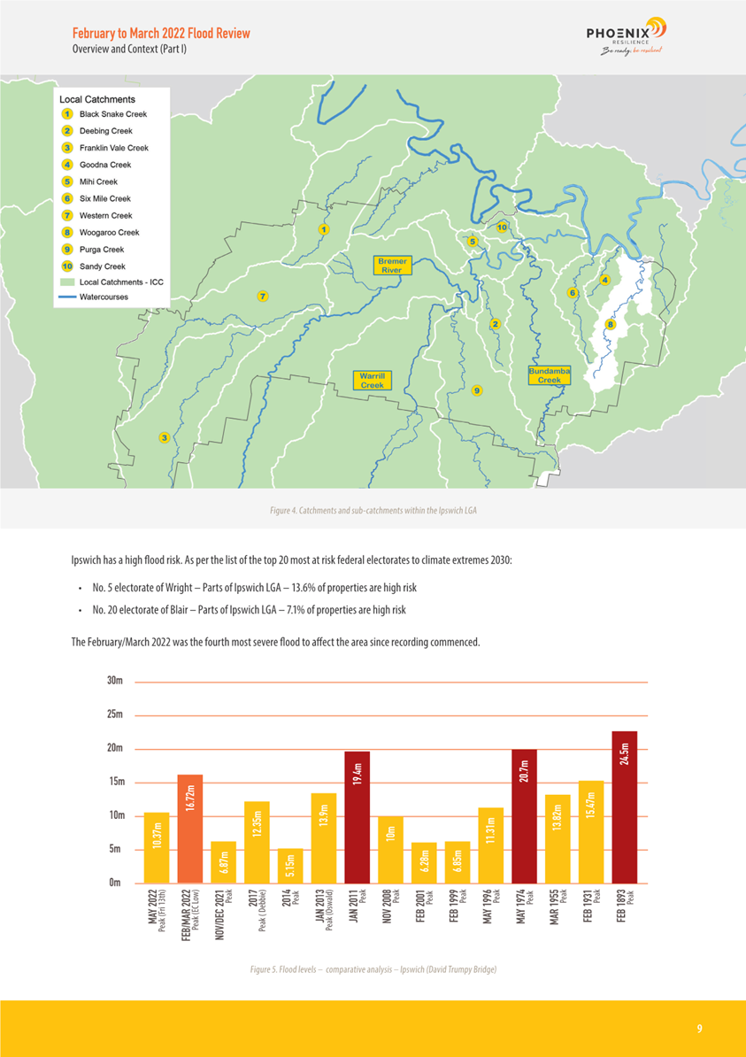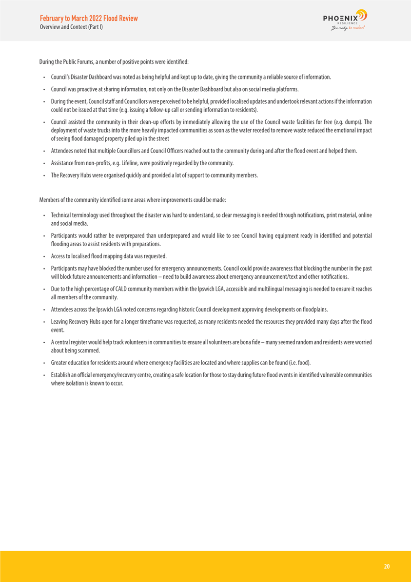 On the 24 February 2022, days prior to the flood event Council adopted the Ipswich Integrated Catchment Plan (IICP). The IICP was the culmination of over 2.5 years of work across multiple departments and is the most detailed and comprehensive flood study ever undertaken by council. The Plan is intended to ensure the Ipswich community is ready, informed, and resilient ahead of the next flood event. Community consultations and forums were undertaken through the development of the IICP.