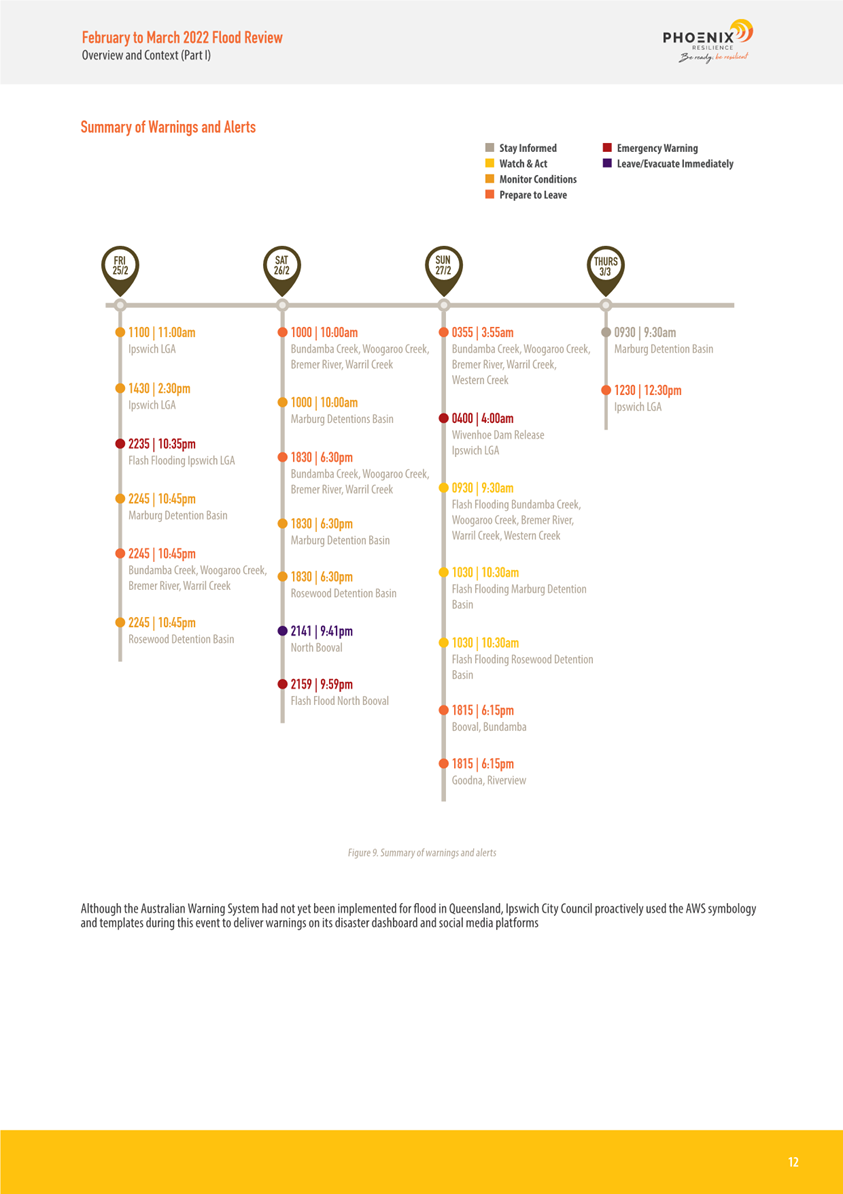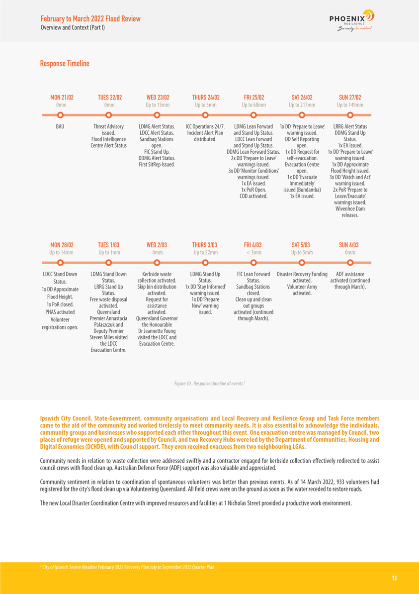 The timing of the Council Flood Review 2022, including community consultation, intended to avoid overlap with the South East Queensland Rainfall and Flooding February to March 2022 Review conducted by the Office of the Inspector General of Emergency Management (IGEM), which was delivered across the disaster management sector including the 23 affected local governments (pursuant to the IGEM functions outlined in Section 16C of the Disaster Management Act 2003).