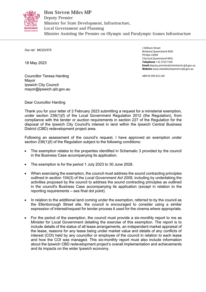 Correspondence from the Deputy Premier, Minister for State Development, Infrastructure, Local Government and Planning dated 18 May 2023 (refer Attachment 1) confirmed approval of a new exemption for both retail and commercial leasing. The exemption conditions council to adhere to the sound contracting principles detailed in section 104(3) of the Local Government Act 2009, specifically through a number of safeguards to ensure openness and transparency with regard to the related transactions.