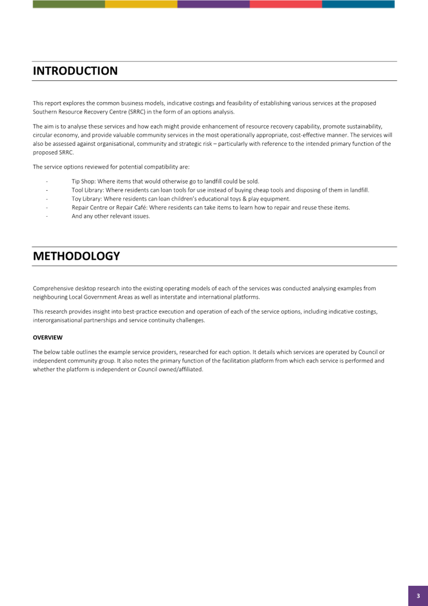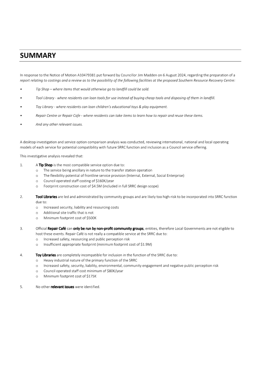 In response to the Notice of Motion (A10479381) put forward by Councillor Jim Madden on 13 August 2024, regarding the preparation of a report relating to costings and a review as to the possibility of additional facilities and services at the Southern Resource Recovery Centre (SRRC), a desktop investigation and service option comparison analysis was conducted and collated in the attached report.