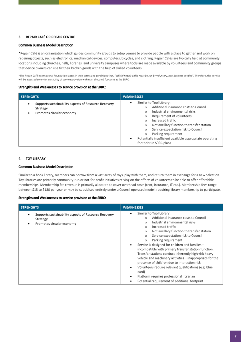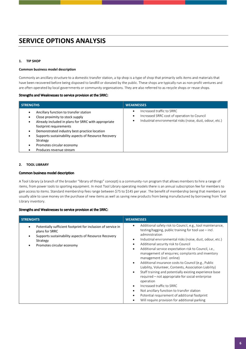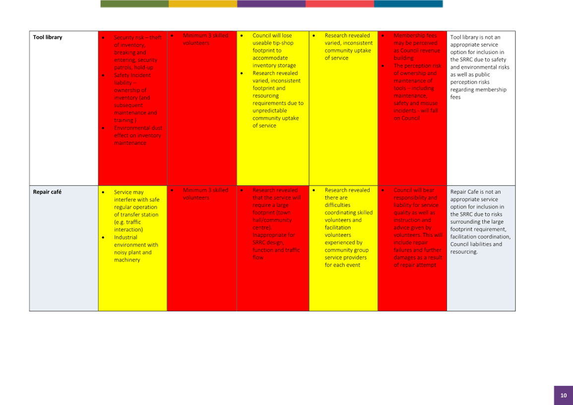 In summary the tip shop as already planned is the most consistent site usage in relation to associated waste activities. The Tool Library, Toy Library and Repair Café, whilst strongly supported in principle as sound circular economy practises are not best suited for co-location at the SRRC for a range of risk, traffic management and suitability reasons, and these should be explored and supported at other Council locations such as Community Centres.