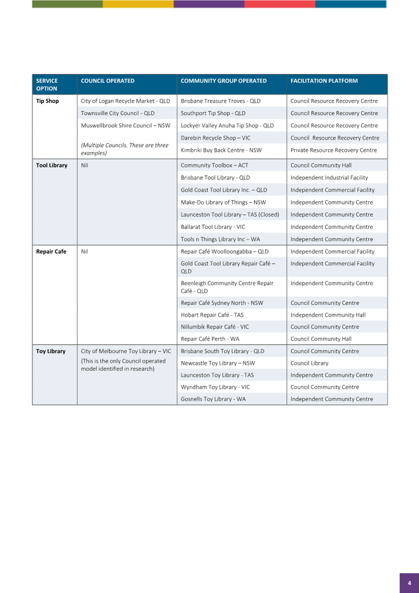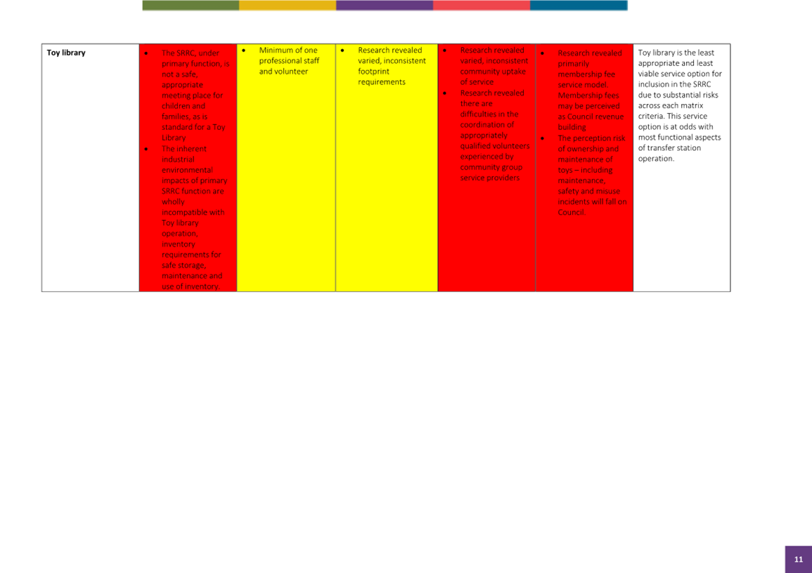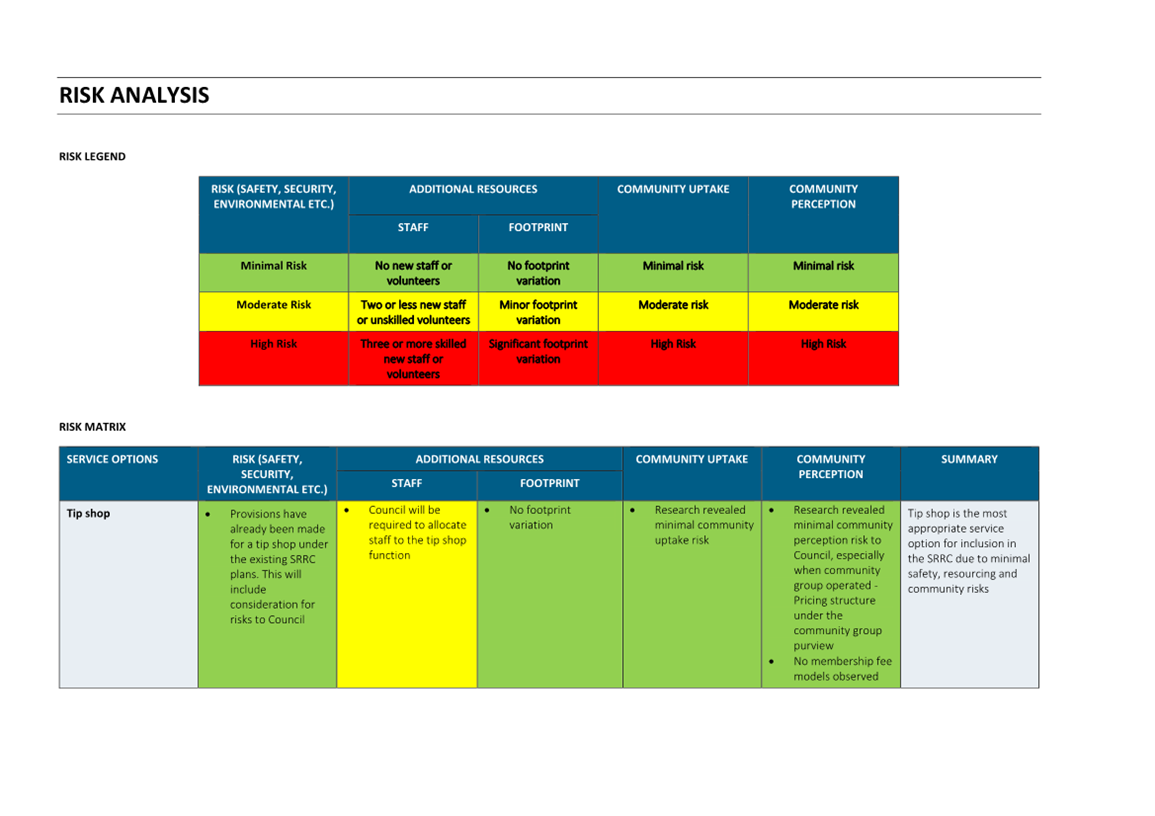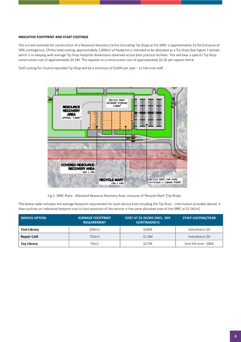 In summary the tip shop as already planned is the most consistent site usage in relation to associated waste activities. The Tool Library, Toy Library and Repair Café, whilst strongly supported in principle as sound circular economy practises are not best suited for co-location at the SRRC for a range of risk, traffic management and suitability reasons, and these should be explored and supported at other Council locations such as Community Centres.