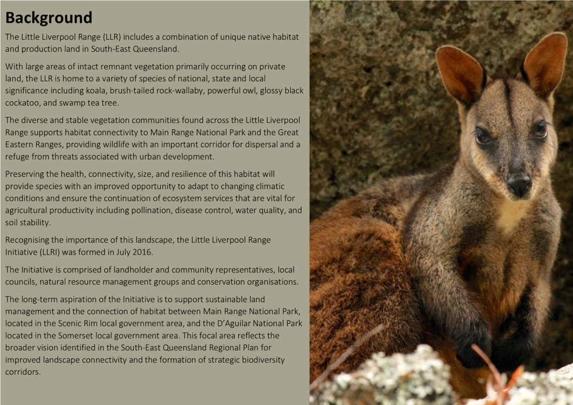 In recognition of the importance of this landscape and the value of formalising a partnership, the Little Liverpool Range Initiative was formed in July 2016 and has been built on a collaborative partnership between Ipswich City Council, Queensland Trust for Nature and the Turner Family Foundation. The Initiative is comprised of landholder and community representatives, local councils, natural resource management groups, research institutions, and conservation organisations who work collaboratively to coordinate land management efforts at a regional scale, ensuring the natural beauty, wildlife and landscapes of the Little Liverpool Range are maintained for future generations.