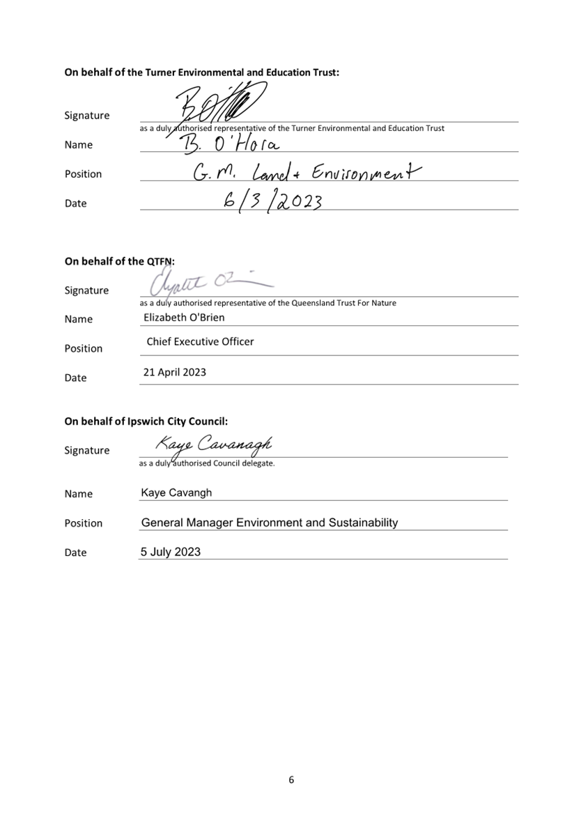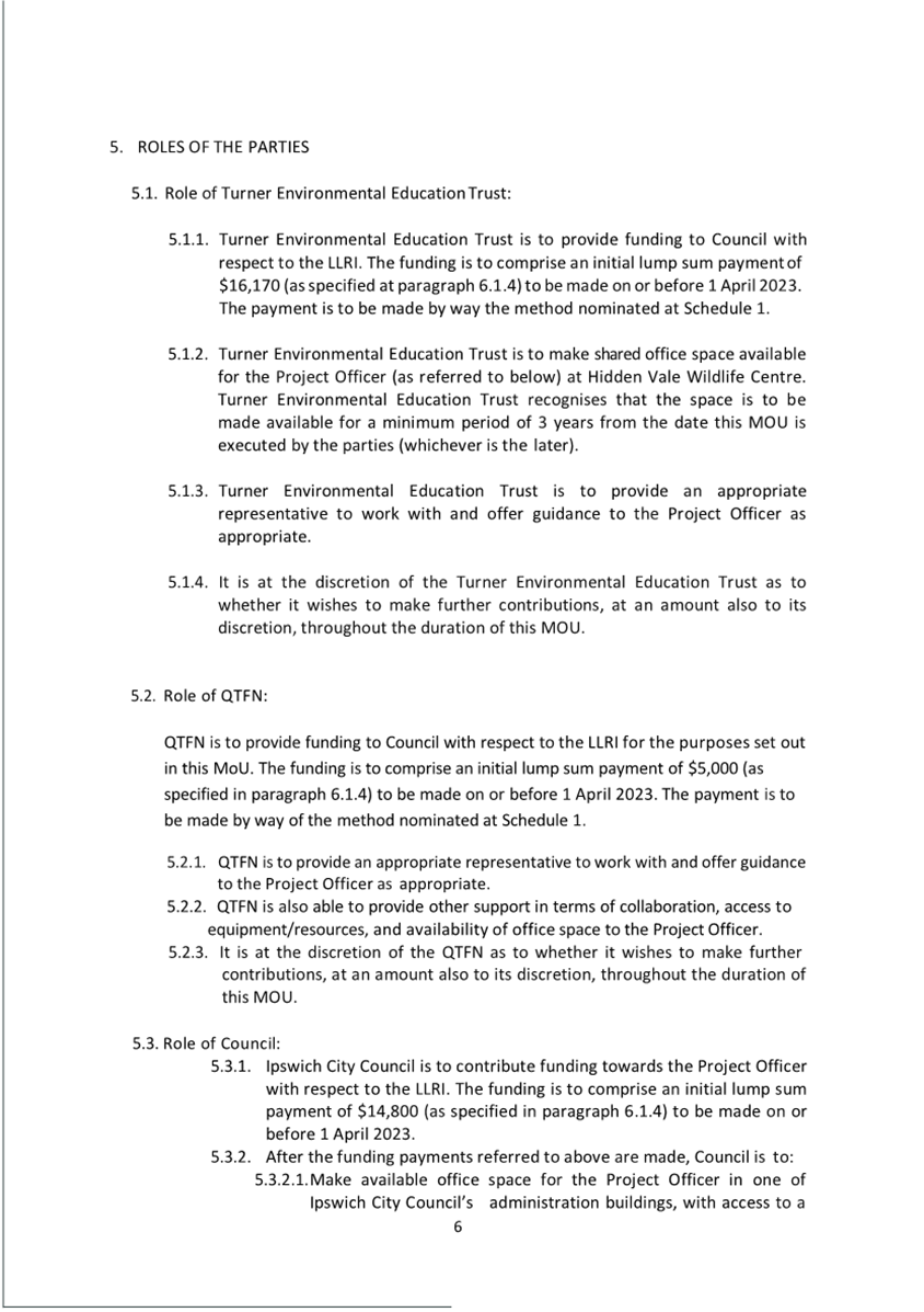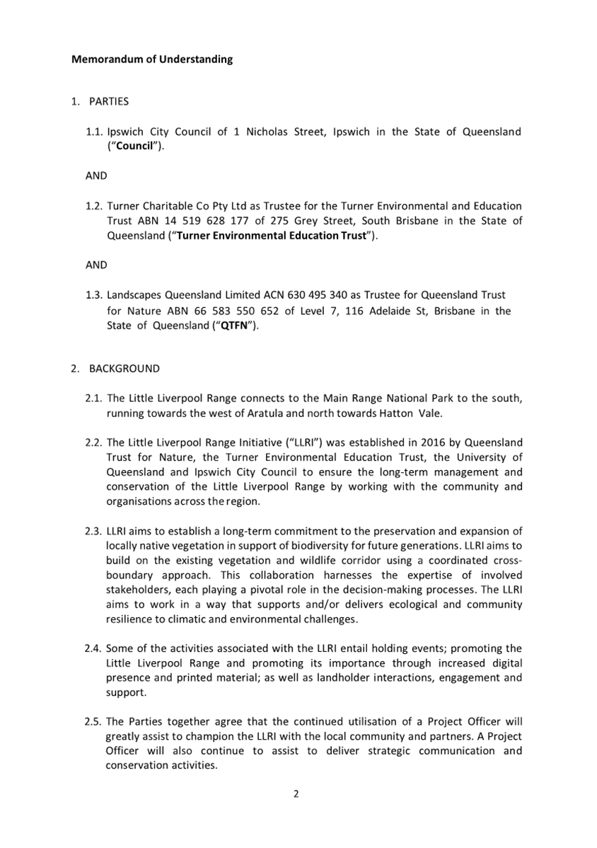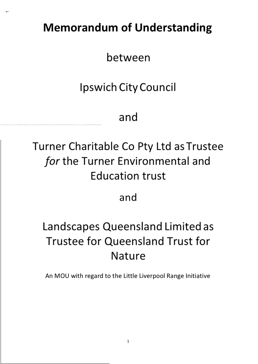 A Memorandum of Understanding (MOU) (attachment 2) outlines the agreed condition of the funding arrangement between Council, Turner Family Foundation and Queensland Trust for Nature over three (3) years which has been extended since 2016 and the value of contributions increased. The MOU is due for review in 2026.