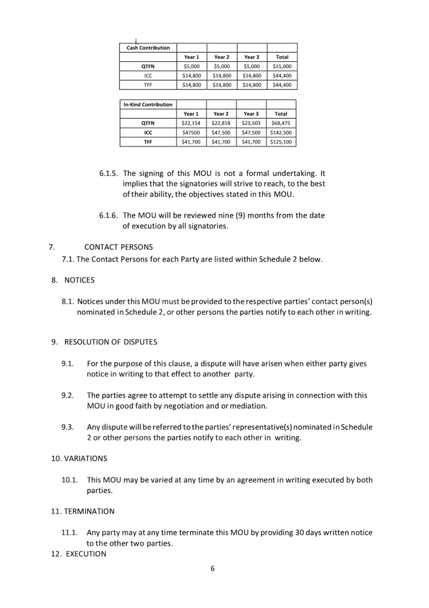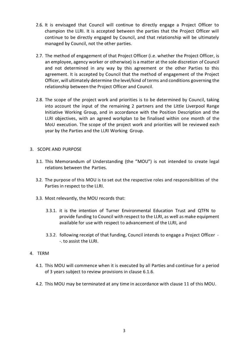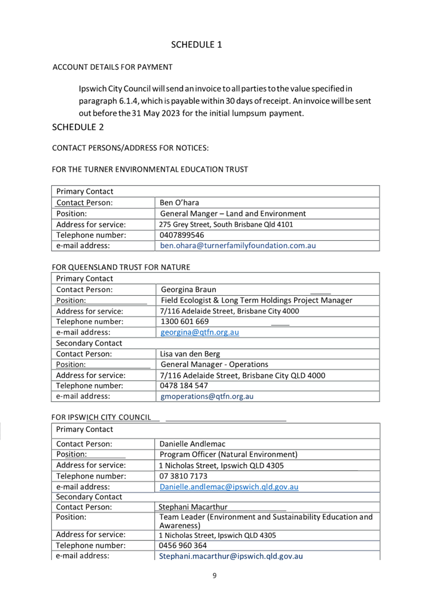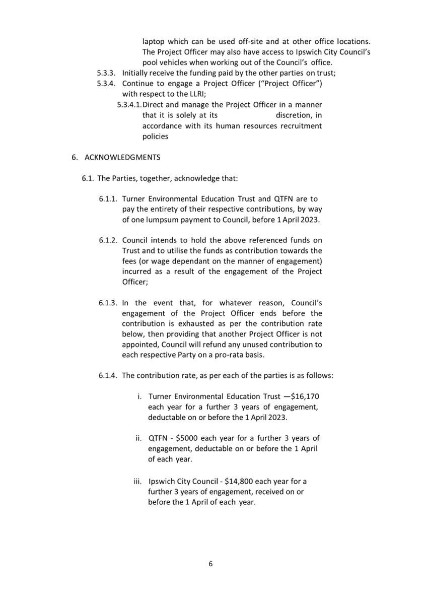 A Memorandum of Understanding (MOU) (attachment 2) outlines the agreed condition of the funding arrangement between Council, Turner Family Foundation and Queensland Trust for Nature over three (3) years which has been extended since 2016 and the value of contributions increased. The MOU is due for review in 2026.