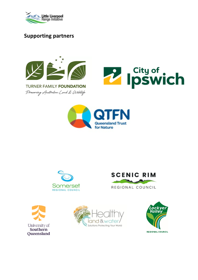 · Turner Family Foundation and Queensland Trust for Nature provide an annual financial contribution towards materials and services and in-kind contributions towards achieving the Strategic Plan.
