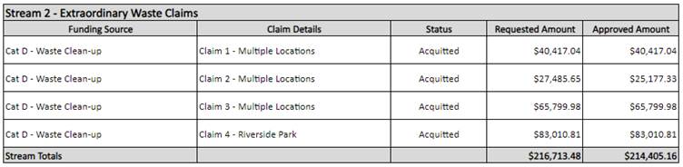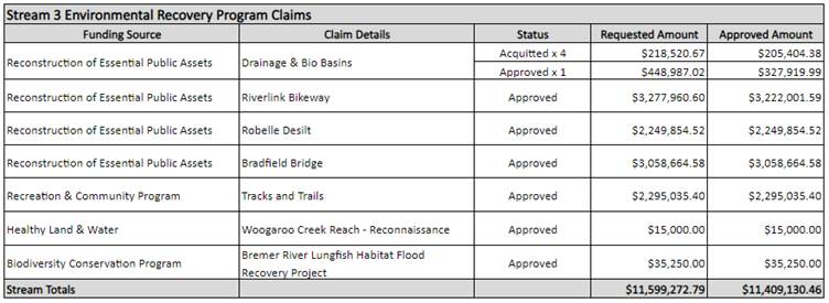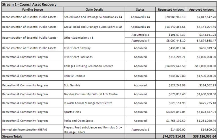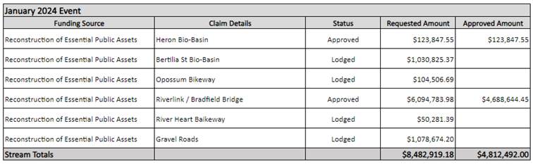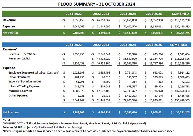 Council is currently working with the Queensland Reconstruction Authority (QRA) and other Departments regarding the costs associated with the February and May 2022 flooding and January 2024 flooding events.