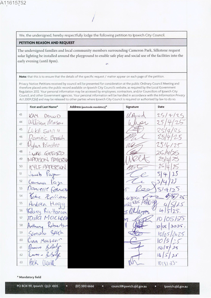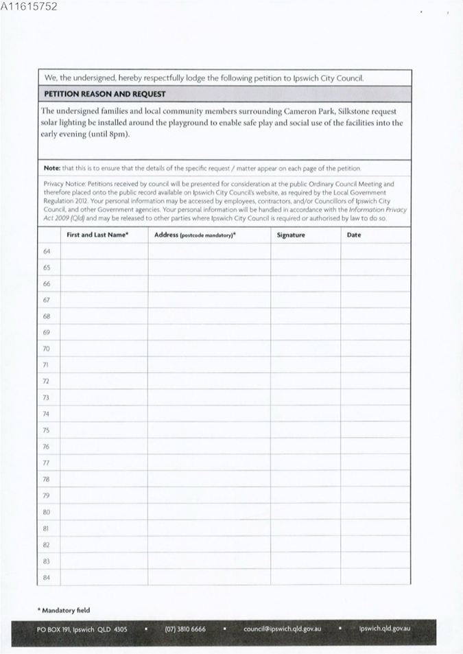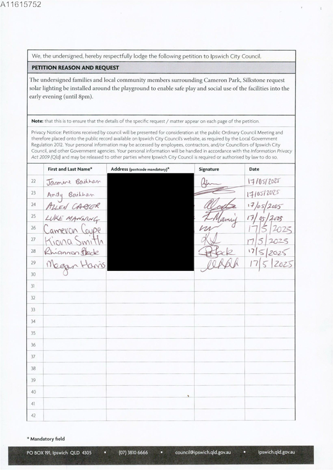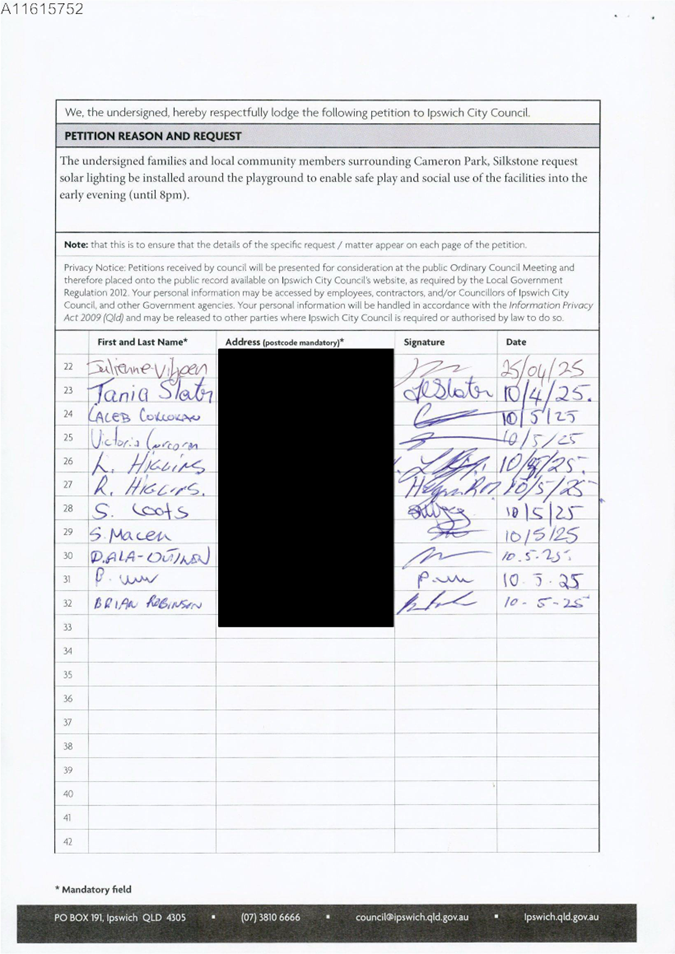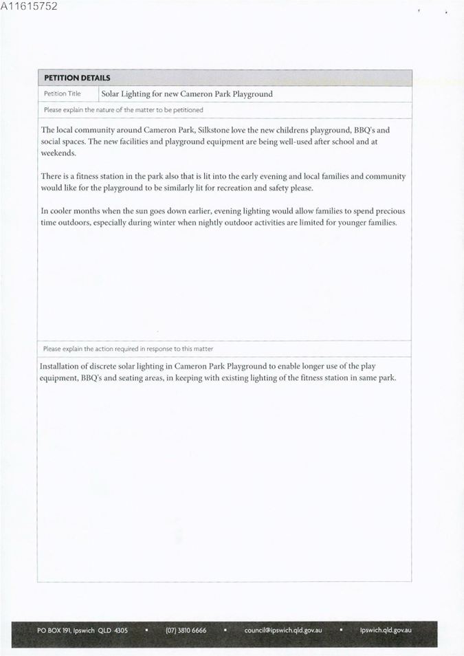This is a petition received from Mrs Josephine Hutt on behalf of residents of Division 3 requesting solar lighting for the new playground at Cameron Park, Silkstone.