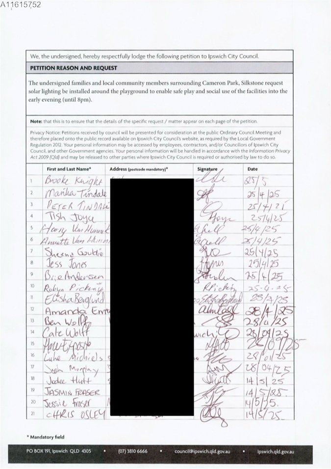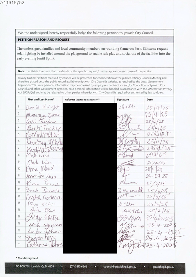 7.1 Petition - Solar Lighting for new Cameron Park Playground.......................... 5